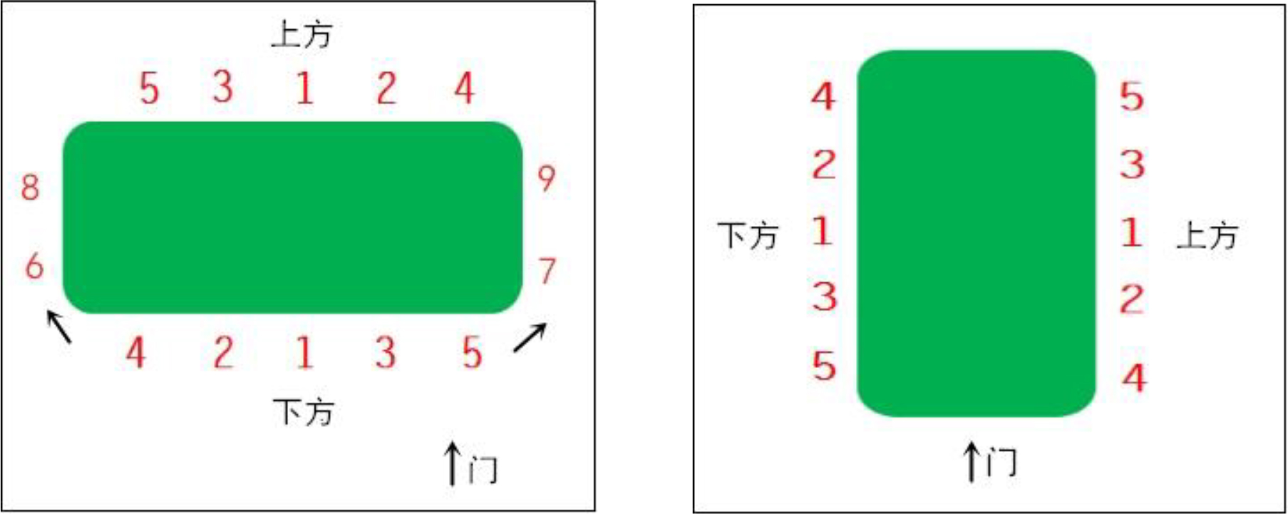 a)主人和主賓座位居中,主方位于進(jìn)門右側(cè),客方位于進(jìn)門左側(cè);