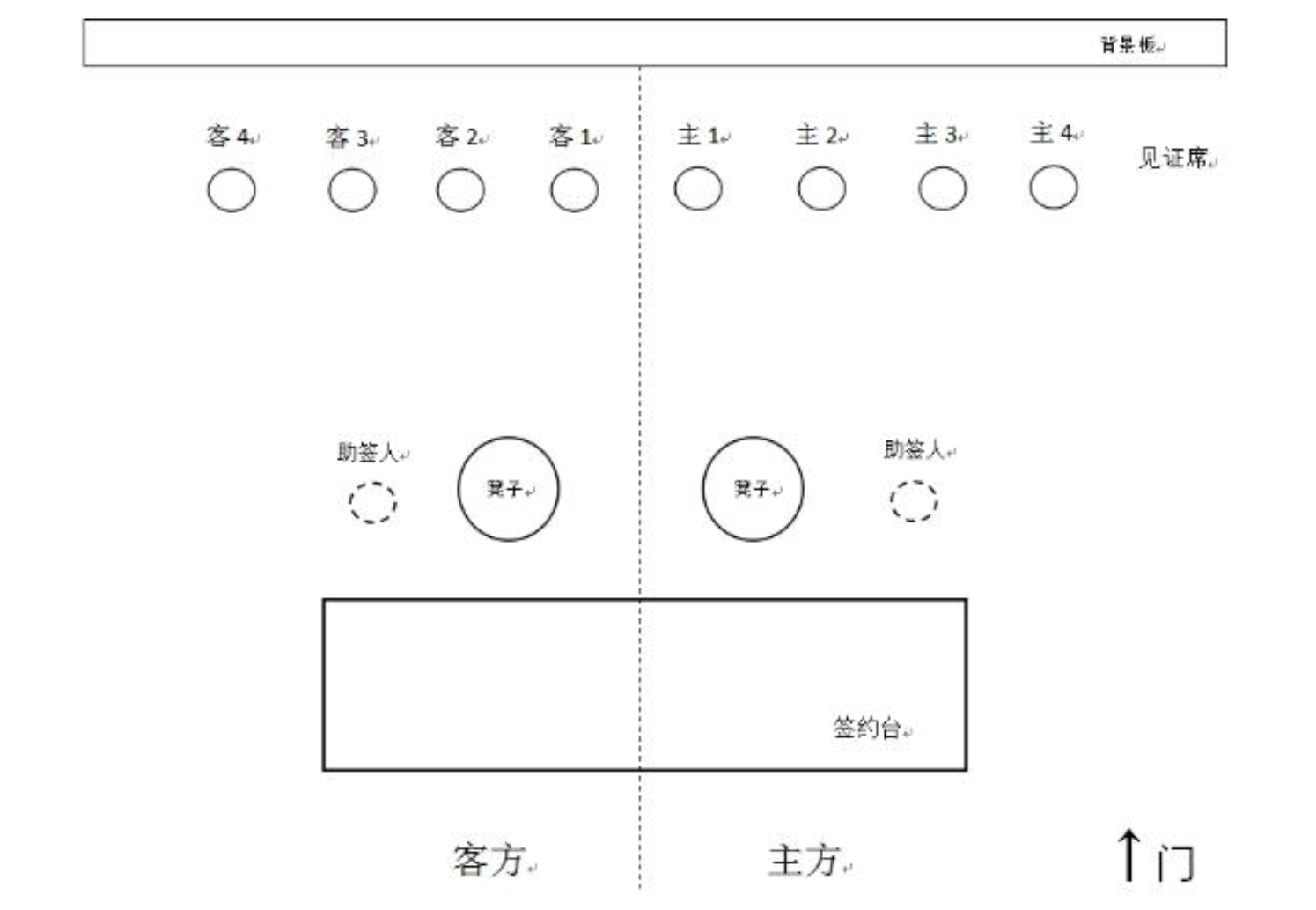 a)簽約人就坐于簽約臺后,主方位于進(jìn)門右側(cè)、客方位于進(jìn)門左側(cè);