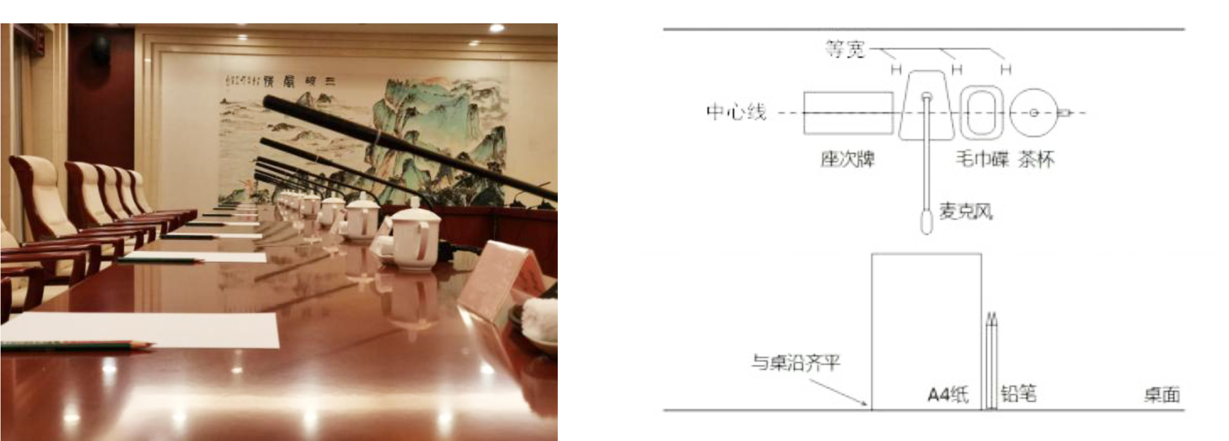 座牌、話筒、毛巾碟、茶杯從左至右依次擺放,中心線橫向呈一條直線并距桌外沿20cm(適用于寬70cm~75cm會議桌),間距1cm;話筒擺放位置、弧度整齊劃一,麥頭與桌面高度25cm;茶杯擺成一條直線,杯把統(tǒng)一向右(可擺放杯墊),杯把與垂直方向呈90度角(或45度角);會議資料和A4便簽紙整齊擺放在桌子居中位置,緊貼桌子下沿,鉛筆置于A4便簽紙右側(cè),見圖B.1。