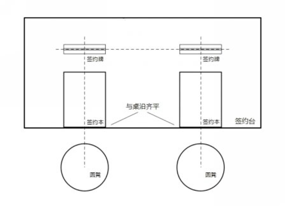 簽約牌、簽約本、簽約凳豎向呈一條直線,放置于簽約桌1/4處,簽約本下邊沿與簽約桌邊沿齊平,筆置于簽約本右側(cè),簽約牌中心距簽約桌外沿20cm,見圖B.3。